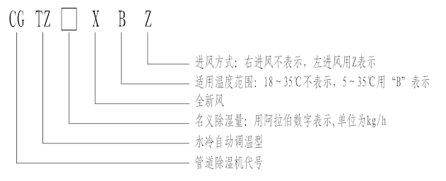 1. CGTZ60X:表示名義除濕量為60kg/h,進風方式為右進風,適用溫度范圍為18℃~35℃的全新風水冷自動調溫型管道除濕機