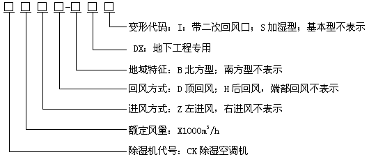 型號示例: CK12-DX 表示名義風(fēng)量為12000m3/h,回風(fēng)方式為端部回風(fēng)的南方型地下工程用除濕空調(diào)機(jī),面對機(jī)組控制器,回風(fēng)口在右側(cè)。